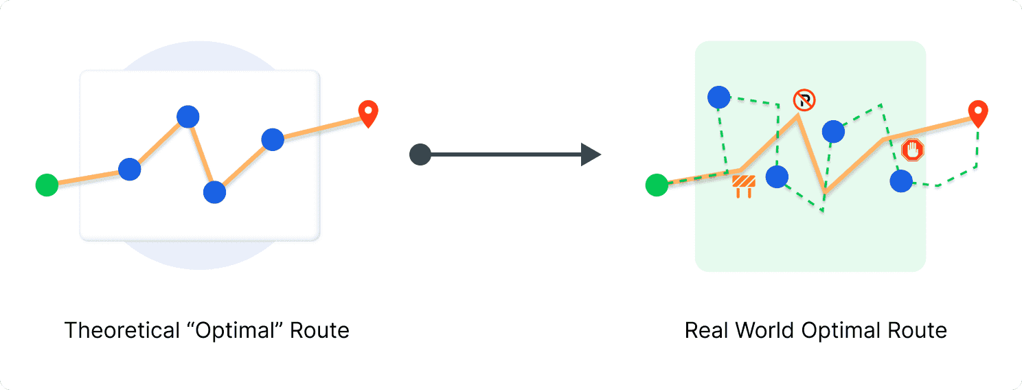 The issue with traditional route optimization algorithms is that they optimize the sequence of deliveries to minimize the total distance covered by the vehicle fleet, which often conflicts with the preferred routes of drivers. This occurs due to the disparity between real-world drop-off locations and the shipping addresses provided by customers.