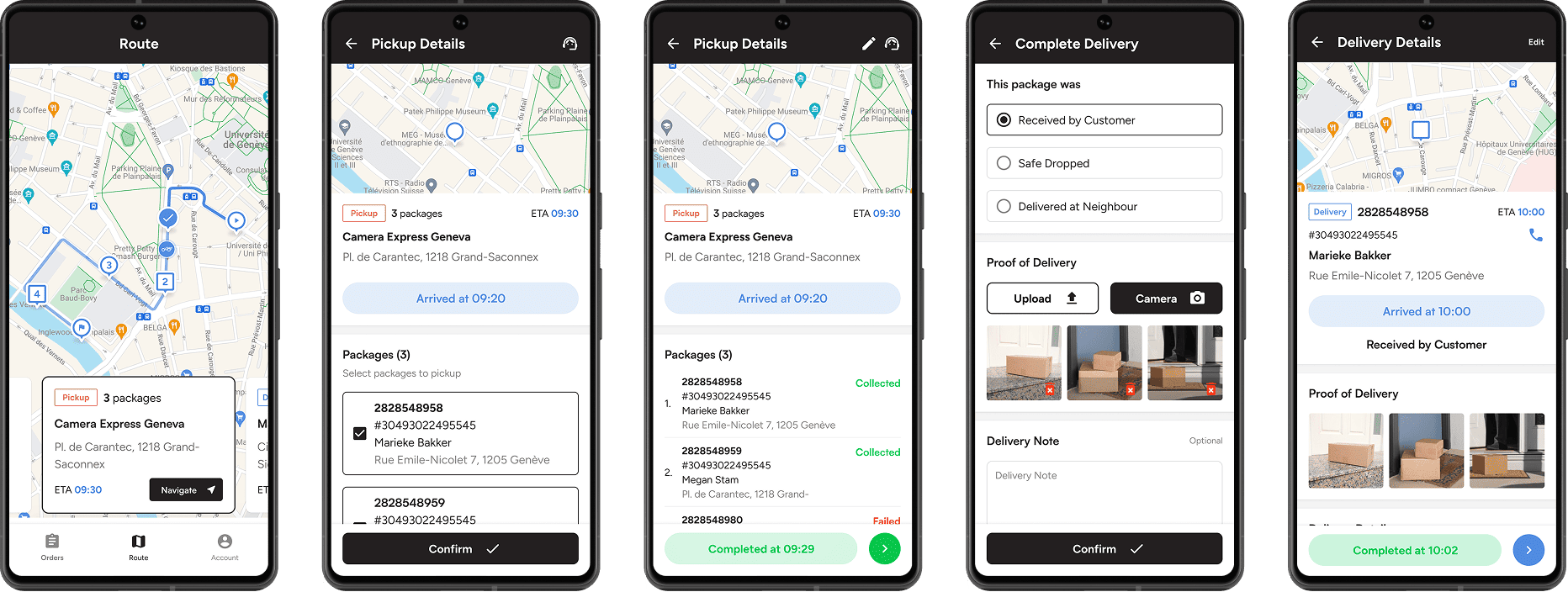 On successful delivery, the drops off the package and takes a photo proof of delivery (POD). The time of delivery, location and POD are saved on the backend. Admin staff can use this information to confirm that the package was delivered safely and resolve any disputes.